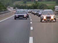 Das BMW-Team-München auf dem Weg nach Rothenburg. (links) Nicht alle haben es bis zum Treffen geschafft: Ein andere BMW-Fan hatte mit seinem schönen E30 touring 20m vor dem Treffen einen Motorschaden!!! Mann ist das peinlich, aber geil geknallt hat's... (rechts)